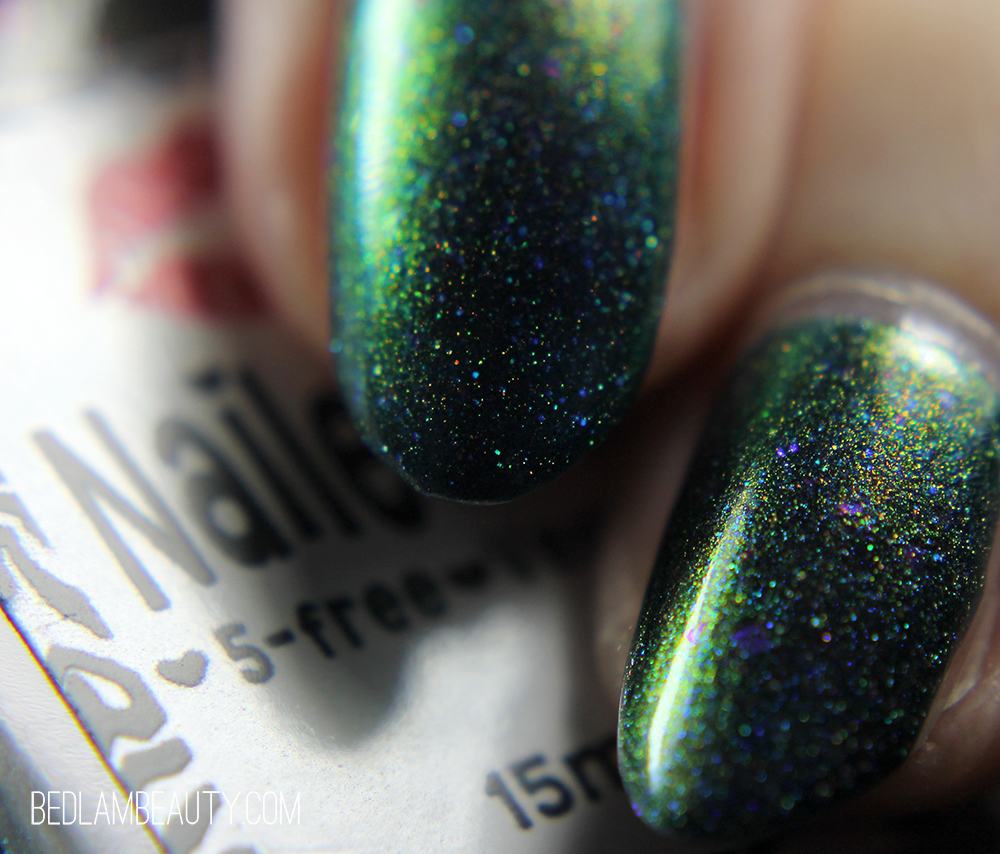 Ms Tia created a smooth, satiny multichrome that is drenched in holo. It reminds me of the inside of a satin cloak, with the dark edges evoking a velvety near-blackness. There are a few flakes peeking out of this creamy formula like the flash of a blade above a "lovely assistant". The face you see is a warm violet with navy leanings, but you'll get a strong green flash as you move your fingers.
